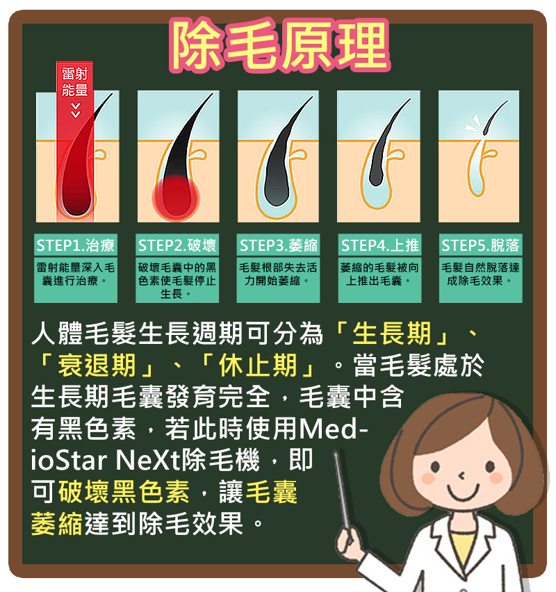 每到炎熱的夏季,大家總是紛紛換上清涼無袖,卻總是忘記腋下那搓黑嚕嚕的毛髮,不僅美觀扣分還容易滋生細菌卡油垢!MedioStar Next除毛機能減緩治療過程中的疼痛感並解決各種除毛困擾,輕鬆解決雜亂的毛髮。