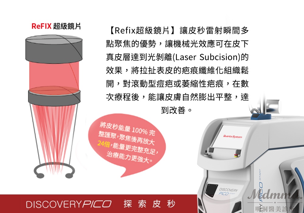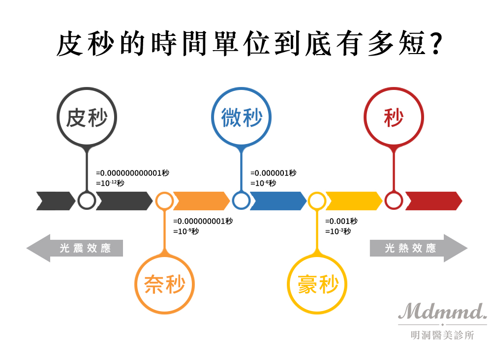 皮秒是一種時間單位「10的負12次方秒(10-12)」。皮秒雷射,指的就是10-12秒超短脈衝時間的雷射方式!利用產生的純粹機械光震效應,可在不到一秒的時間產生強大光震波來粉碎色素斑塊,比傳統「淨膚雷射10⁻⁹秒」更快、震碎效益更高、熱傷害極少、不易反黑、恢復期較短,治療過程也更舒適。