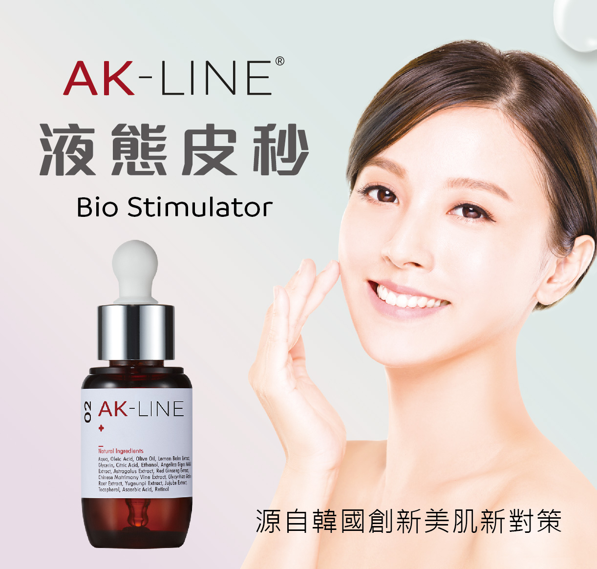 AK-Line液態皮秒循環精華,源自韓國創新研發,Made in Korea! 由韓國知名診所Kim院長創辦,是結合韓方草藥與化學原理研發出的特殊配方,是當今 韓國最具話題性的新概念美容技術!每二週進行一次,透過漸進的5次美容療程,由內 而外的改善肌膚問題,還原健康的肌膚狀態!