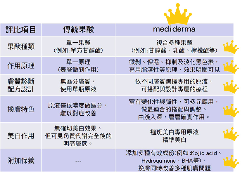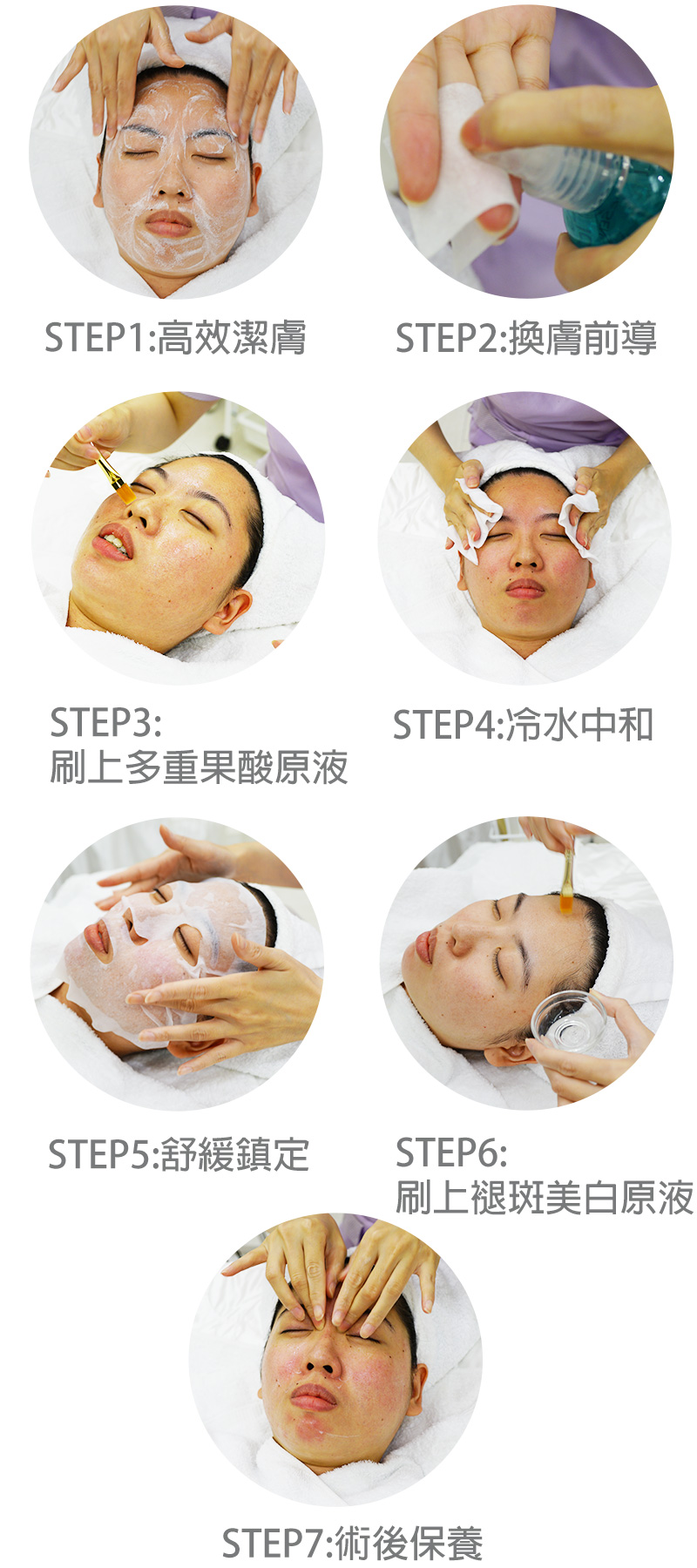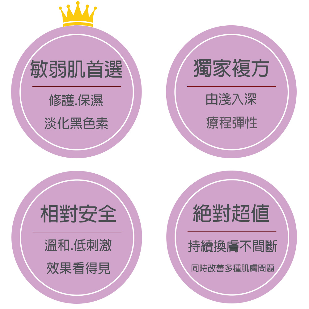 A: 使用之果酸比市售居家產品更濃縮,通過醫師專業評估及專業人員操作下方可使用,以確保療程安全性與煥膚效果。將會有完整後續保濕修護可以達到保濕及鎮靜之效果,使肌膚光滑細膩、皮膚透亮、使青春痘、腫疤鎮定改善。